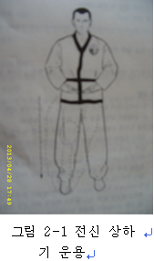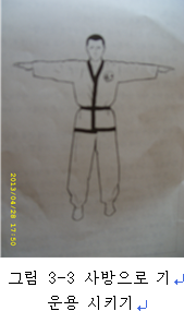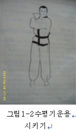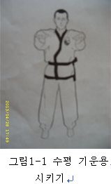 [1]양 다리는 어깨 넓이로 벌리고 양 손은 단전 앞에서부터 시작하여 양 팔을 앞으로 곧게 들어 올려 평형을 이루도록 한다[그림1-1]