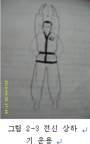 [4]양 손이 단전 부위에 이르면 위쪽으로 향했던 양 손바닥을 몸 쪽으로 향하게 한 후 천기 받기의 역순과 같이 곧장 가슴을 따라 기를 끌어올려서 최대한 들어 올린다[그림2-2]