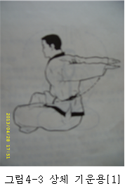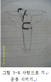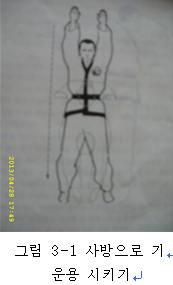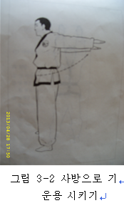 [3]몸과 머리는 정면을 향한 상태에서 양 팔의 간격을 시종 일정하게 유지하며 오른쪽 방향으로 최대한 뒤로 돌린 다음[그림1-2]서서히 원상태대로 돌아온다