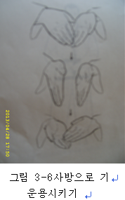 [11]주먹 하나가 들어갈 공간을 두고 반원을 그리며 손을 돌린다[그림3-6]이때 위에 있던 손은 아래로 아래에 있던 손은 위로 교차 된다