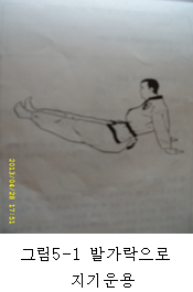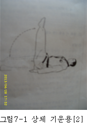 [2] 발목을 곧게 뻗고 단전에 전신의 힘을 모아 서서히 두 다리를 수직[90도]으로 들어 올렸다 내렸다 한다[그림7-1][30초 정도] 발뒤꿈치와 지면과의 사이가 5CM정도 되었을 때 내리기를 멈추고 다시 서서히 들어 올린다