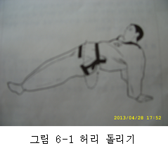 [6]이와 같이 오른쪽 방향으로 연속 3번 행한 후 다시 왼쪽 방향으로 연속3번 행 한다 [1분30초정도][양 다리를 옆으로 넘길 때 손목이 엉덩이 밑에 깔리게 되므로 손목의 힘을 사용하여 넘어가는 동작과 일으켜 세우는 동작의 속도를 맞추도록 한다]