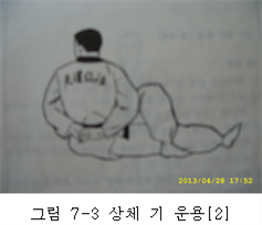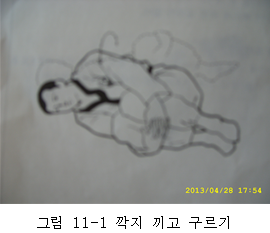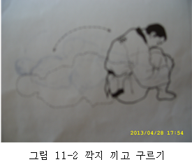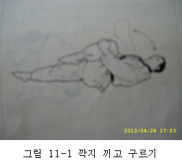 [6]구르기 동작이 끝나면 이번에는 누운 상태에서 오른쪽 방향으로 넘어갔다 바로 일으키기[8초 정도 소요]를 연속3번 행 한다 다시 왼쪽 방향으로 넘어 갔다 바로 일으키기를 연속3번 한다[48초 정도][그림11-3]