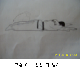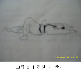 [2]왼쪽 다리를 45도 정도 굽혀 오른쪽방향으로 전신을 밀어 엎드린 자세가 되도록 하여 굽혔던 다리를 곧게 편다음 손끝과 용천으로 기를 끌어 당긴다[30초][그림 9-2]