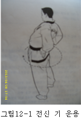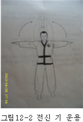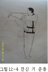 [6]이번에는 단전에서 시작하여 오른쪽 방향으로 어깨 높이만큼 최대한 뒤로 젖혀 손목을 턴 다음 다시단전까지 돌아와 이번에는 왼쪽 방향으로 같은 방법으로 턴다[그림12-4] 이때양팔은 일정한 간격을 유지하며 허리를 최대한 뒤로 털며 시선도 자연스럽게 따라 간다