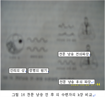 이것이 음의 진동파를 통하여 대 우주와 인간 사이의 氣(기)의 통로를 연결 한다는 수련 천문이다 그리고 日月山水(일월산수) 해와 달이 음양으로 그려져 있고 산 그리고 바람이 불어 파도가 치는 그림이 산뜻하게 그려져 있는 일명 眞理(진리)의 像(상) 천도선법은 천문과 진리의 상 즉 소리 수련과 형상수련이 조화되어 몸과 마음 [心身(심신)] 어느 한쪽으로도 치우치지 않고 심신이 완벽히 조화를 이루는 탁월한 수련법이다 따라서 수련천문 과 진리의 상은 천도선법의 핵심적인 요체이다