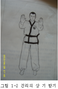 *양 다리는 어깨 넓이로 벌리고 양 손을 펴고 단전 앞에서부터 시작하여 자연스럽게 양 팔이 평형을 이루도록 하여 앞으로 곧게 뻗은 상태로 어깨 높이까지 천천히 들어 올린다음[그림 1ㅡ2]