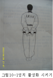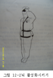 *왼쪽 방향으로 허리를 최대한 틀어서 지기를 끌어 올리며 상체를 들어 올려 처음 동작을 시작한 자세로 돌아간다 [그림12-1]