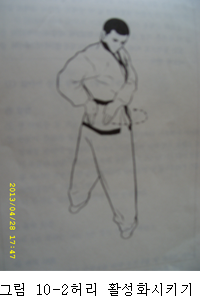 *양 발의 발끝을 모으고 서서 양 손바닥은 엉치와최대한 가까이 하여 엉치뼈를 중심으로 왼손과오른손이 각각 원을 그리며 기를 돌린다