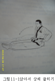 *상체를 굽힐 때 는 코가 무릎에 닿을 정도까지 최대한 굽힌다 이때 무릎이 굽혀 지지