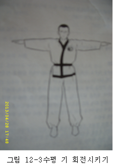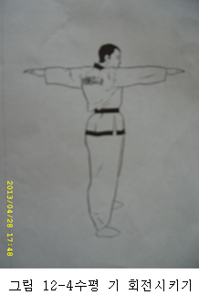 *양 팔이 앞뒤로 수평을 이루게 되면 팔은 고정시킨 상태에서 시선이 손끝을 응시하고 허리를 최대한 틀면서 시선도 함께 손끝을 따라 최대한 돌아간다[그림12-4]